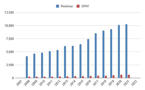 For what I would call as a boring business, the consistency of their business growth is remarkable - over the past 13 years, revenue has grown 7.18% p.a., and OPAT 7.46% p.a.