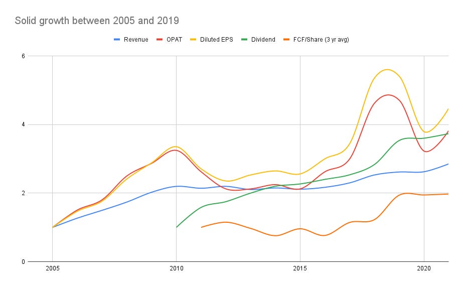 Between 2005 and 2021, this was a reasonably good business, growing revenue (5.5%) and OPAT (6.40%), while paying back vast majority (~2/3rds) of free cash flow as dividends, and reducing its share count slightly1 (reducing by 1.3% per year). So, even if the company was not trailblazing in any manner, it was a reasonably consistent well run enterprise, maintaining shareholders returns as a priority.