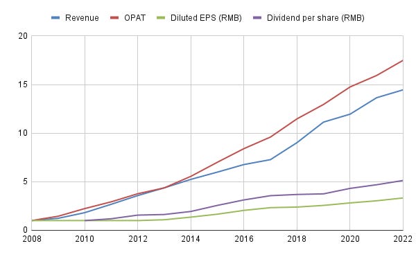 The increases in OPAT are not directly translated to increased in EPS, largely due to dilution in the stock base, with outstanding shares increasing from 2,264Mn in 2010 to 3,120Mn in 2022. Much of this increase has happened on H-shares and not in the domestic shares. I have dug through the reports to see where the dilution of the share count is coming from, but beyond employee and management incentive schemes, there is nothing much more of note here. It is obviously not ideal to have 844Mn shares added to the registry over 12 years, but it is likely that competition for talent has forced the hand of the management on this. Nevertheless, even with the stock dilution, as mentioned earlier EPS has compounded at 13-14% over the past 15 years or so.
