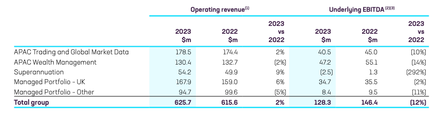 Core will contain Wealth Management, Trading and Markets, and SuperAnnuation, which combined generated AUD 363 Mn in revenue and AUD 90.2 Mn in EBITDA in 2023, or EBITDA margin of 25%.