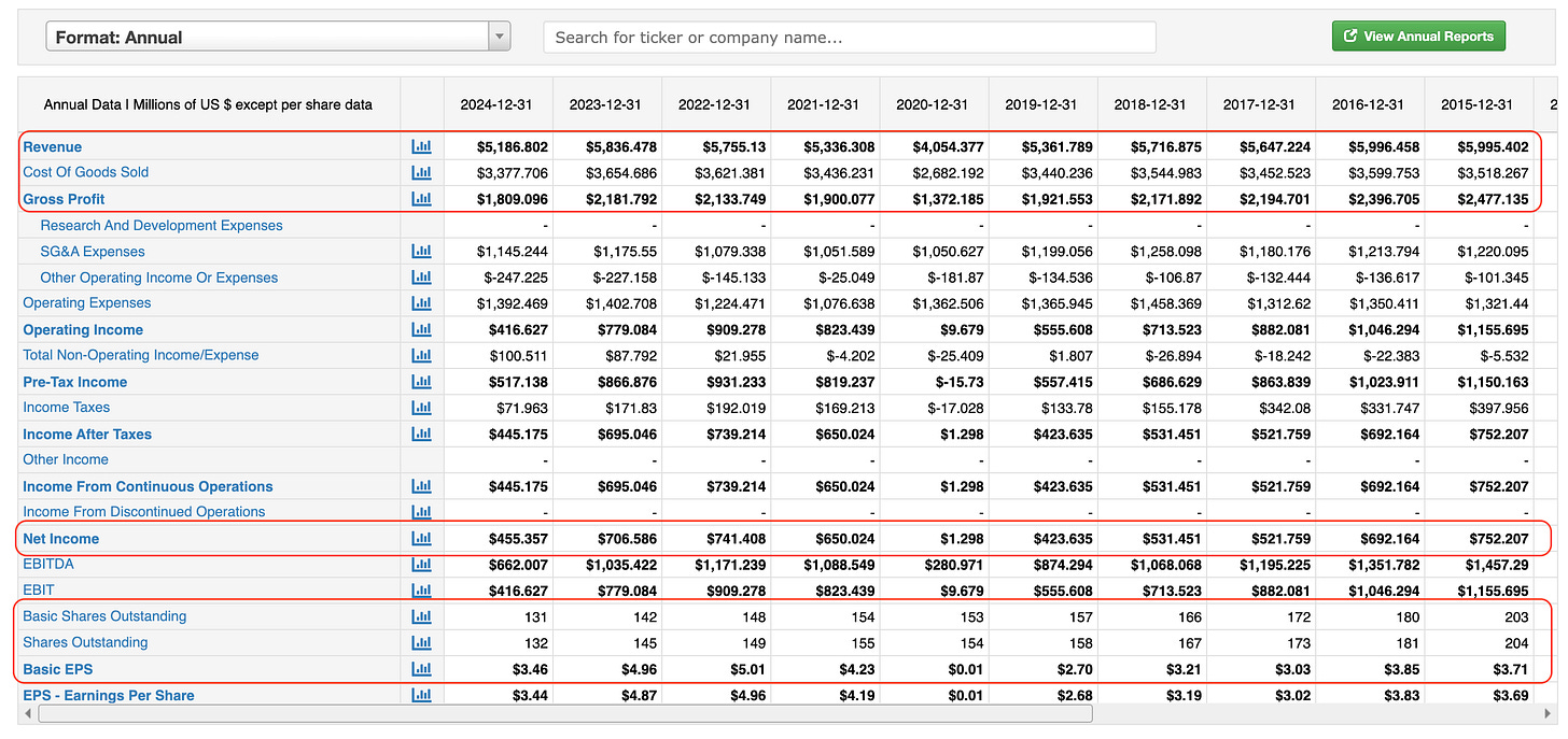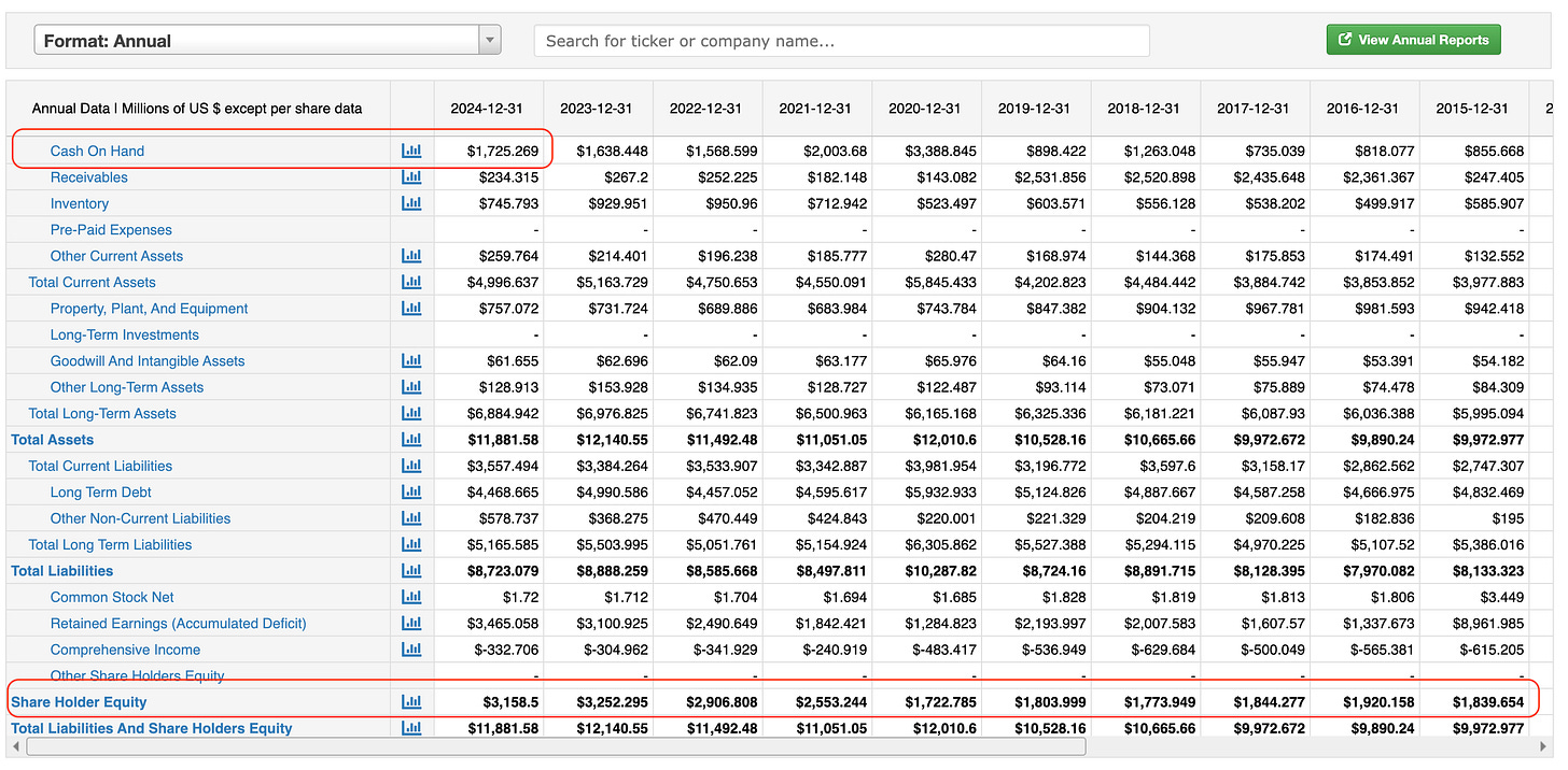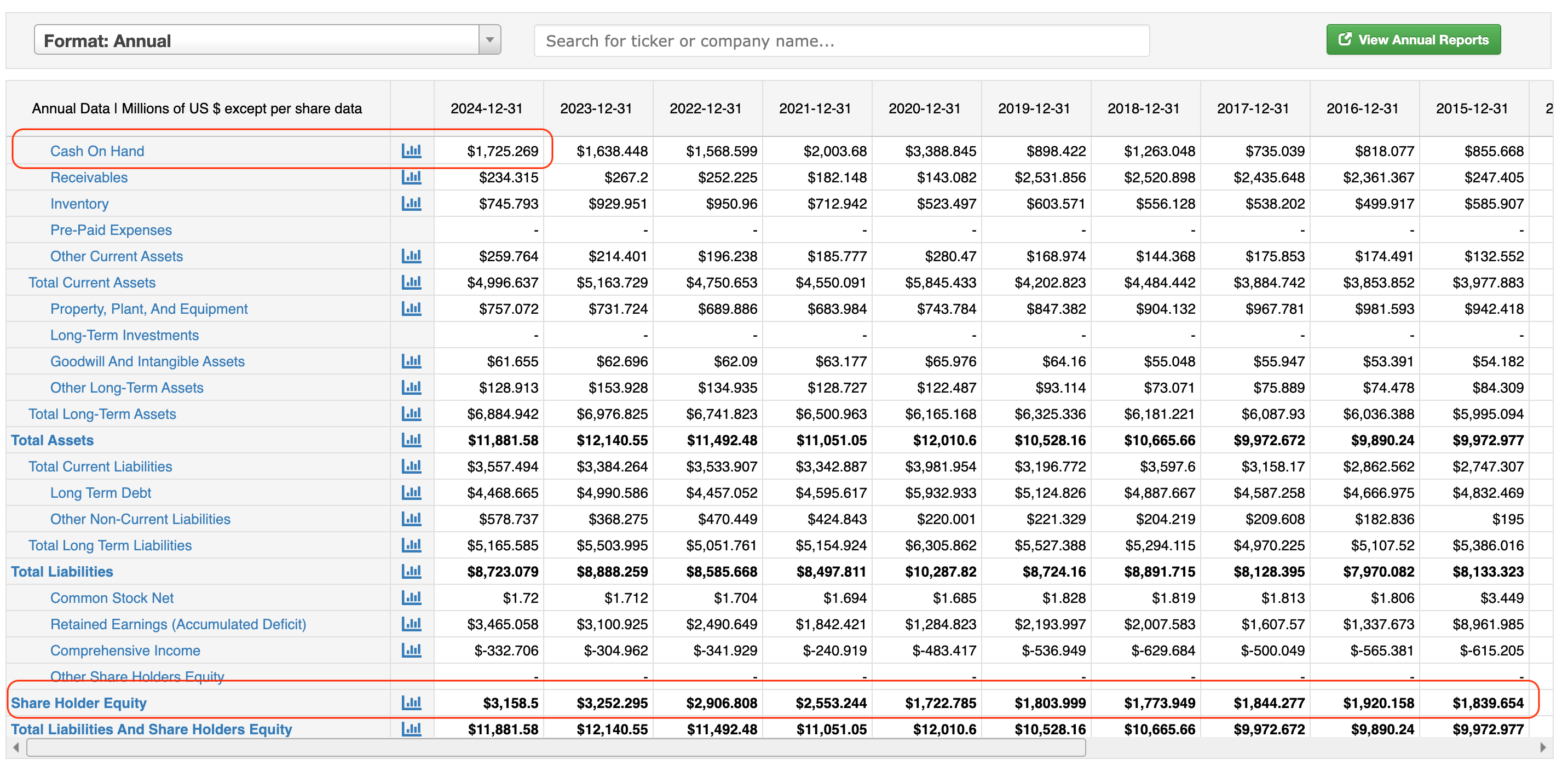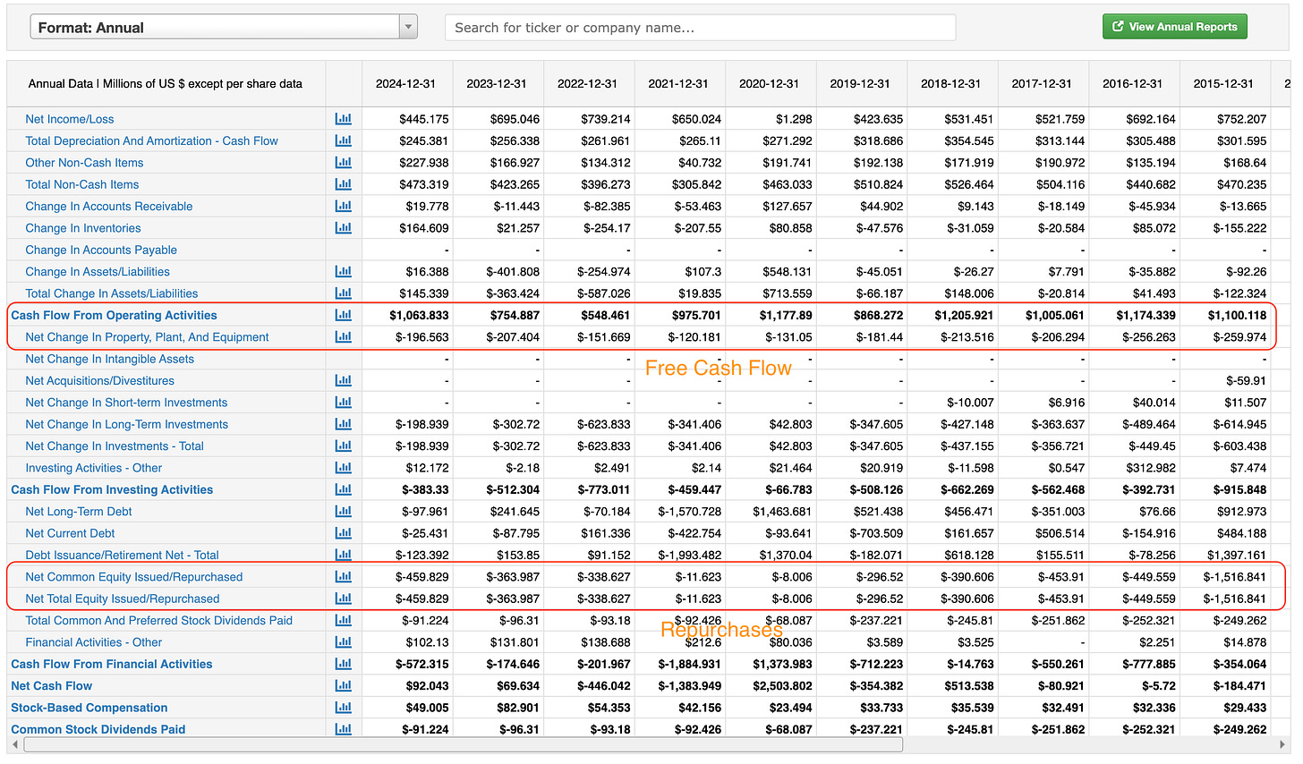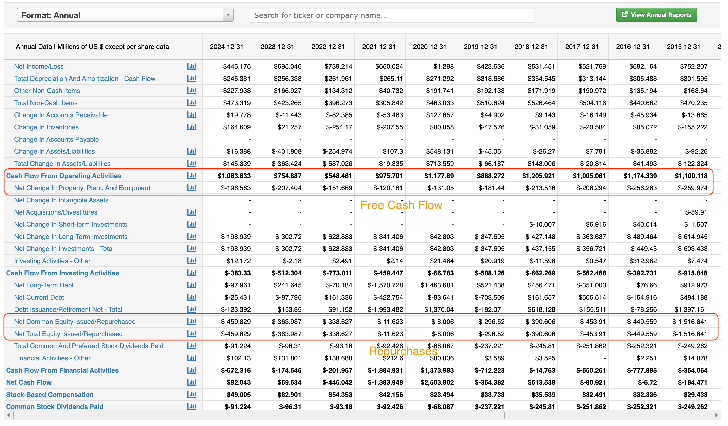 Pay special attention to the outstanding shares line—the company has been reducing its stock count as if its shares are going out of fashion, burning away a third of its outstanding shares in the past 10 years. Maybe there’s a cash flow problem? Let’s look at that too.