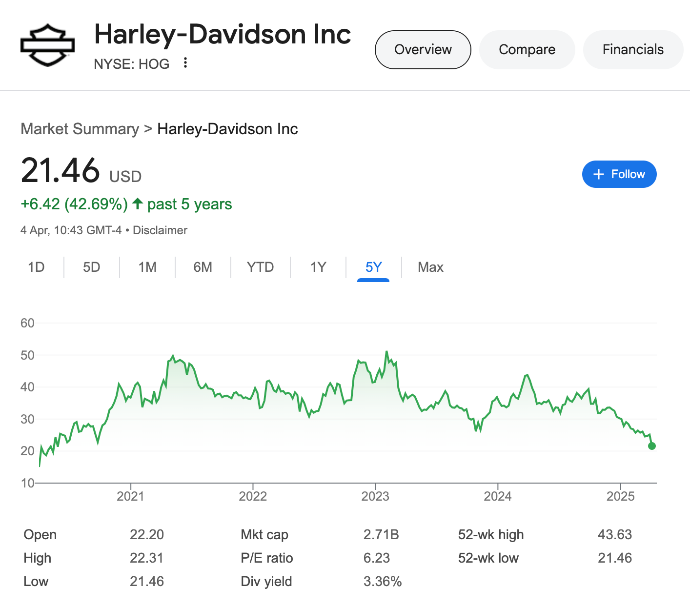 So why is the stock so depressed today? The announcement of tariffs seems to be the biggest factor—fears that U.S. tariffs will be reciprocated by the rest of the world, particularly the EU, which could impact sales in those regions. For instance, Canada and the EU account for about a fifth of its sales. Harley-Davidson’s overall market share stood at 37.3%, lower than in the past. The narrative goes: "Harley-Davidson is losing market share brand, a fifth of its sales are under threat from retaliatory tariffs around the world, which will put pressure on margins." This all seems plausible.