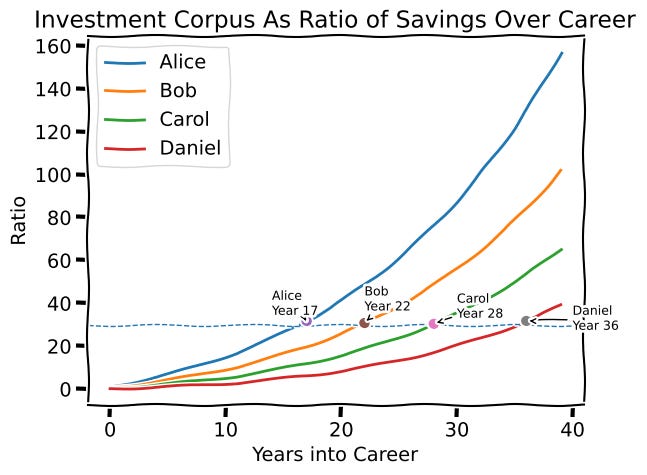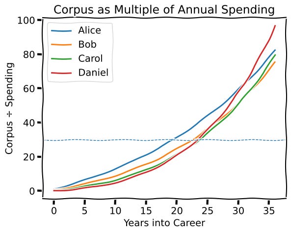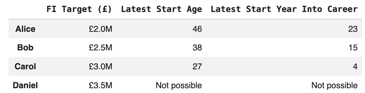 Alice, with her low overhead, doesn’t even need to start until she’s 40. Meanwhile, Carol needs to have her life together by age 27, not too long after her career starts. Daniel stands no chance in this scenario.