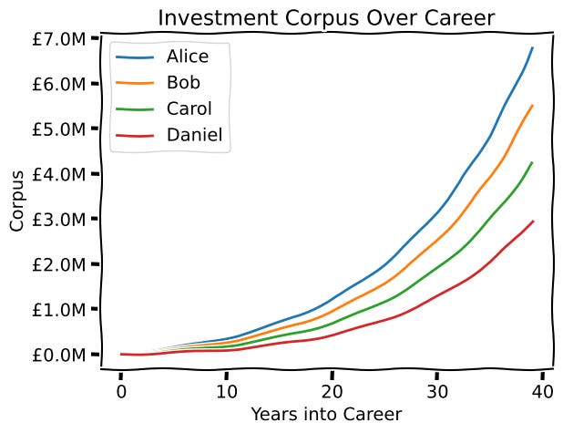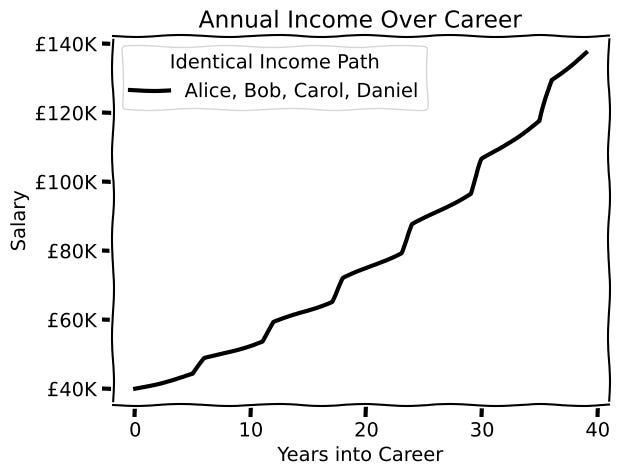 Meet our four lab rats: Alice, Bob, Carol, and Daniel. They all start their careers at 23, earning a very respectable £40,000 (roughly the UK median). They are identical career clones: 3% annual raises and a 10% “I’m essential” promotion bump every five years.