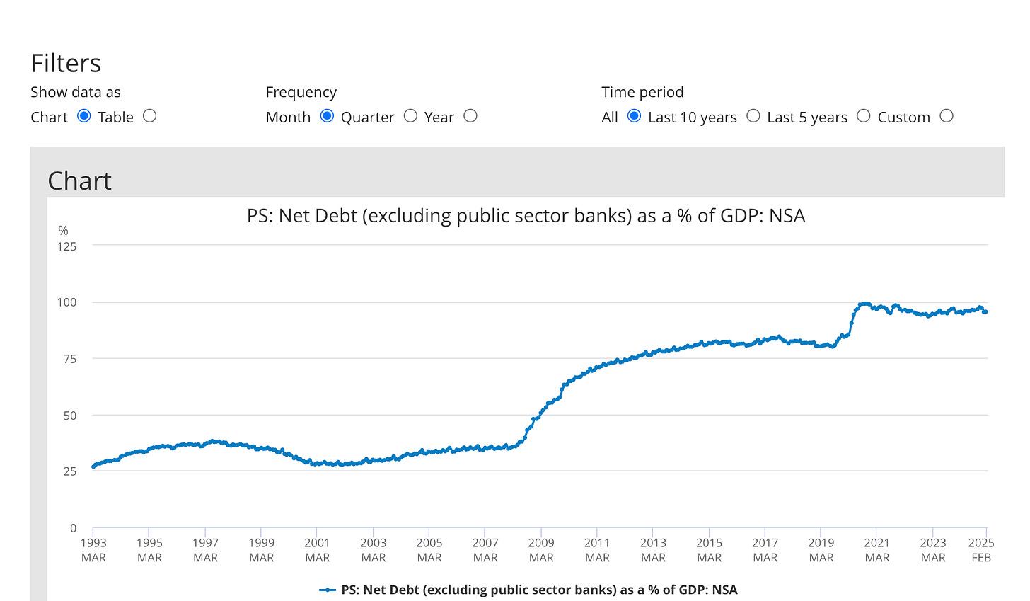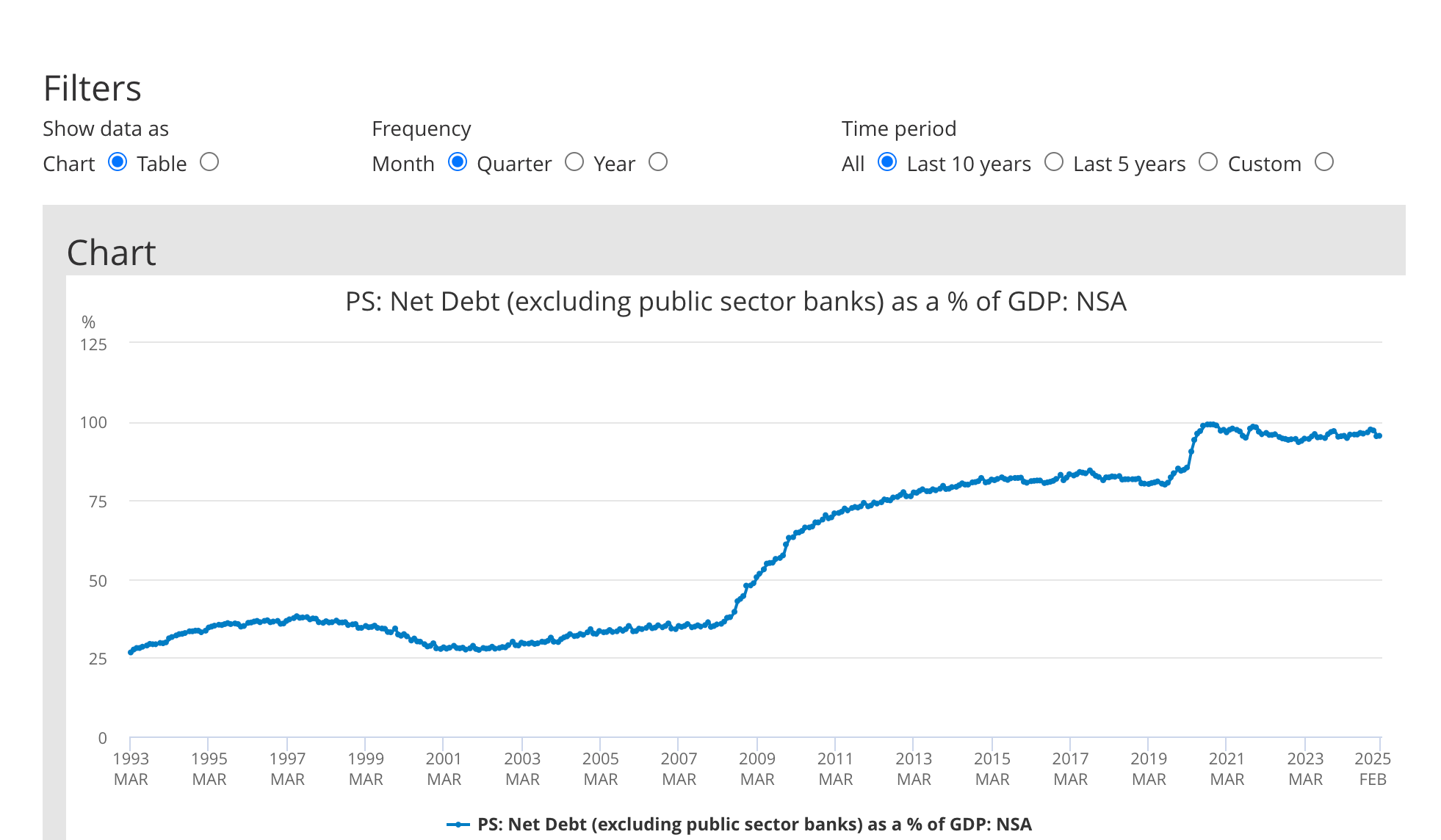 Interest payments are concerning. In fact, in general the UK debt levels are concerning. Government debt was just ~40% of GDP in 2002-03; today, it exceeds 100% of GDP. Debt must be repaid eventually, but in the meantime, its servicing cost is an ever-growing drain on public funds. This also means that the tax-to-GDP numbers that we see rising, only tells us partially reality. We are also borrowing a lot that will need to be paid out in the future years.