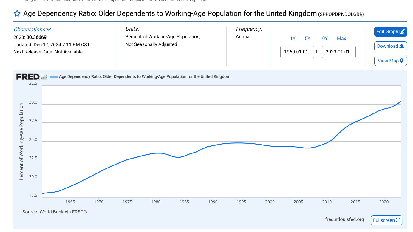 Beyond raw borrowing & spending numbers, there’s another crucial factor: the dependency ratio, which measures the number of non-working adults per working adult. When the UK's welfare state was established (1945-48), the dependency ratio was below 17.5%. Today, it has nearly doubled3. In fact even the number beyond is likely an understatement, as other estimates put it at close to 57%, which essentially means that this has quadrupled in the past 2 generations.